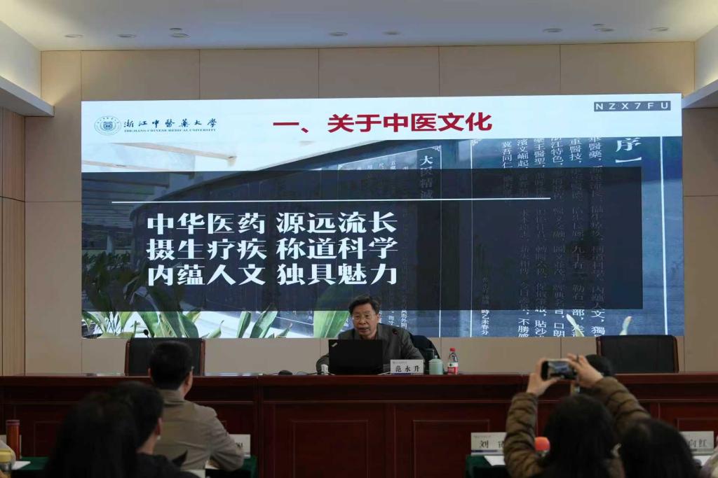 本次学习会特邀浙江省中医药学会会长、浙江中医药大学原校长、国家“973”首席科学家、首届全国名中医范永升教授作中医药文化专题报告。他从文化、中医文化的源头、中医理论与中医文化、中医文化应体现的内容等四个方面简要介绍了中医文化,重点从天人合一与整体观念,因人而异与辨证论治,致中和与阴阳平衡,未雨绸缪与治未病,仁者爱人、修身克己与大医精诚等五个方面详细介绍了中医文化的基本内容,并希望马院思政课教师弘扬中医文化,促进人才培养,助力健康浙江,推动社会进步。